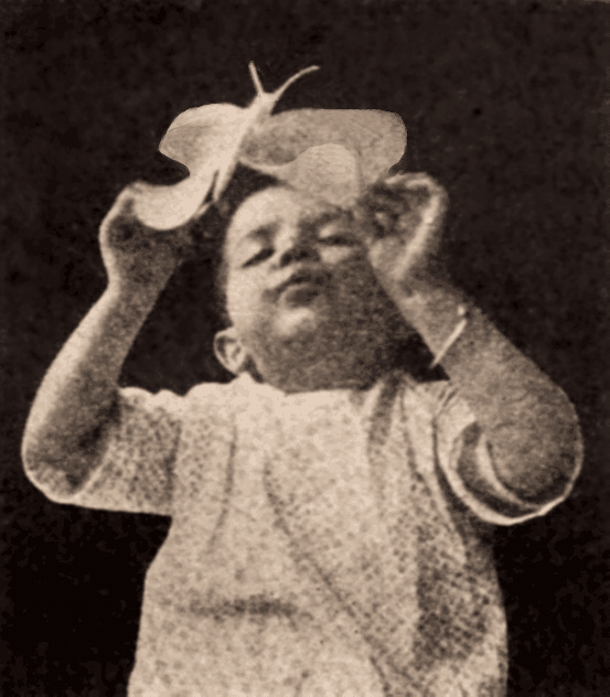 Nen del “Jardí d’Infants” bufant una papallona de paper de seda. |