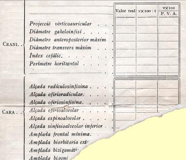La “Fulla Antropològica” A principis del sXX estava de moda l’antropometria, una ciència, o potser més aviat una pseudociència, que estudiava les mesures del cos humà amb la finalitat de comparar-les i associar-les amb trets de la personalitat. Per exemple una aplicació clàssica era “pronosticar” qui podia ser un criminal en potència a partir de les seves mesures facials. El “Laboratori d’Estudis i Investigacions” que es va crear disposava entre d’altres protocols de recollida de dades d’una anomenada “fulla antropològica” per tal de recollir mesures (que avui ens poden semblar esotèriques) de crani, cara, coll, tronc, extremitats,... ¿Quina utilitat podia tenir, per exemple, la “distància umbilicopubiana” o “l’alçada del mànec esternal del tòrax” en l’educació dels sords? Ho ignorem, però aquelles dades no tenen res a veure amb les psicopedagògiques que es recullen actualment, per exemple en els dictàmens d’escolarització, amb l’única fi d’orientar la resposta educativa individual. Millor no recordar que els metges nazis tenien molta afició a tot aquell tipus de dades... |