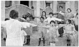 “El llarg hivern” i l’escola “El llarg hivern” és un film rodat el 1992 pel director Jaime Camino, ambientada en la guerra civil espanyola. Un dels seus escenaris és la recreació, al veritable edifici de Vil·la Joana, de l’Escola Municipal de Sords-Muts. Hi van participar diversos alumnes sords de la ciutat. A la pel·lícula figuren algunes escenes que reprodueixen activitats que un dia foren reals. Per exemple: A l’esquerra i a dalt, exercicis de gimnàstica fonètico-respiratòria (1920) que propiciaven l’emissió de diferents fonemes ajudant-se de moviments corporals, una mena de precursora del que decenis després serien els “ritmes corporals” del mètode Guberina, i a sota un assaig per a la posterior filmació. A la dreta i a dalt: Una mestra toca el piano i un alumne posa la ma a la caixa per notar les vibracions (1920), mentre uns altres alumnes, d’esquena, piquen de mans marcant el ritme per audició pura, i a sota la preparació de l’escena corresponent. |