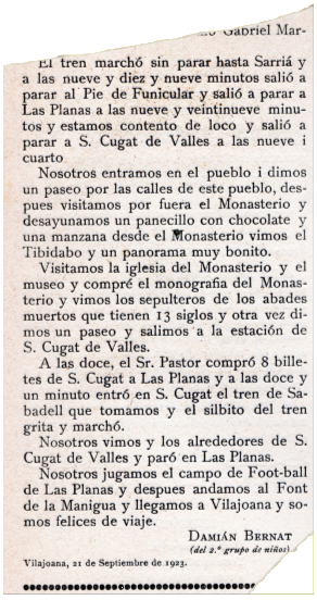 Una altra novetat va ser la revista “Vilajoana”. El primer número va aparèixer el gener de 1923. Així com el professorat redactava la revista “La Paraula”, aquella estava adreçada a l’alumnat de l’escola. En ella es publicaven notes o composicions redactades pels propis nens o nenes, bé esmenats en les construccions de les frases pels seus mestres o bé respectant la redacció original, encara que als ulls del lector s’apreciessin algunes de les errades típiques que a vegades caracteritzen els textos escrits pels nens sords. També incloïa notícies, articles extensos o exercicis-model de llenguatge, d’aritmètica, etc. Aquests darrers apartats eren escrits pels adults, i es fa difícil acceptar que, atesa la complexitat relativa del llenguatge esmerçat, l’alumnat pogués entendre el redactat. Vegeu alguns exemples de textos signats per l’alumnat: |