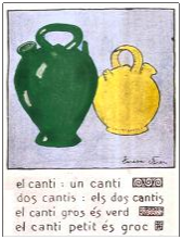 Tota aquesta feina es feia amb el llibre davant de cada alumne/a per tal que aquest/a també veiés les corresponents grafies, tant de “lletra de pal” com lligada. El tercer llibre, un cop apresos tots els fonemes, estava dedicat al lèxic, agrupat per temàtiques. (Es pot veure en el tercer gràfic una pàgina d’animals). L’alumne/a no podia veure el nom de cada imatge, ja que estava escrit a la pàgina del darrera i calia girar el full per comprovar si s’havia encertat el nom que el/la mestre/a preguntava. Es donava la indicació que “els professors fessin vivent entre els alumnes l’ús d’algunes fórmules interrogatives, tals com què és això?, quin?, quants? qui?, de qui?, a on?, què fa?, etc.” |