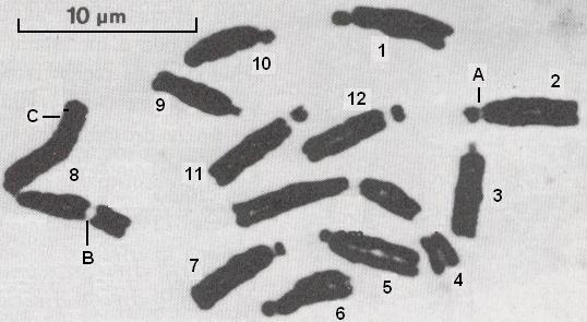 | Aquesta figura mostra els cromosomes d'una cèl·lula somàtica de Vicia faba (favera) que té 12 cromosomes.