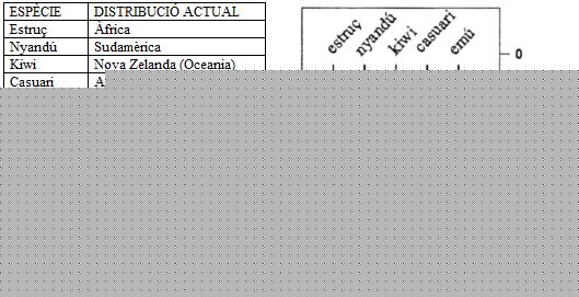La taula indica la distribució actual d’algunes aus no voladores. L’arbre filogenètic representa la seva evolució. L'avantpassat comú d'aquestes aus vivia en un supercontinent anomenat Pangea, del qual han acabat sorgint els continents actuals. Es creu que el trencament de Pangea va afavorir l'origen d'aquestes espècies. | |||