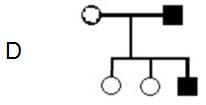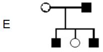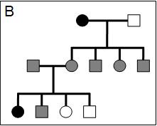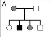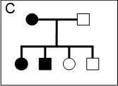 Els tres pedigrís que hi ha a continuació (A, B, C) corresponen a alteracions genčtiques hereditŕries. Els cercles representen femelles i els quadrats, els mascles. Els individus marcats amb color negre estan afectats per l’alteració i els ombrejats amb color gris són portadors d’aquesta (no afectats)-