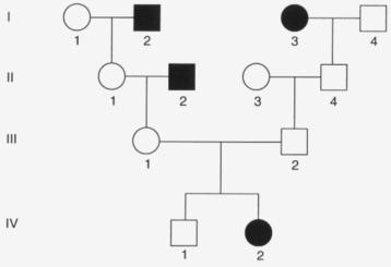 En aquest arbre genealògic, els cercles representen dones i els quadrats, homes. Els individus que pateixen la malaltia estan en negre: