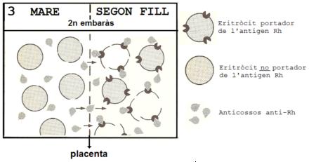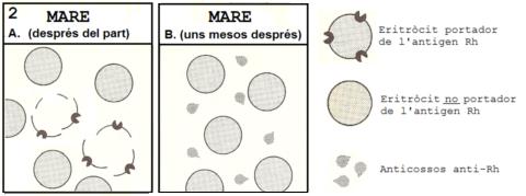 Els gràfics següents esquematitzen el procés a través del qual una dona Rh negativa s’immunitza en el primer embaràs (d’un fill Rh positiu) contra l’antigen Rh.