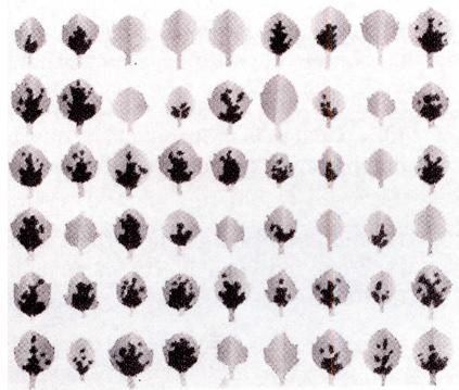 Algunes espècies de plantes presenten dimorfisme en relació a la presència de taques a les fulles: uns exemplars tenen fulles sense taques i d’altres tenen les fulles amb taques més o menys grans. Es va autofecundar una planta amb taques a les fulles. El dibuix mostra una fulla representant de cadascun dels descendents.