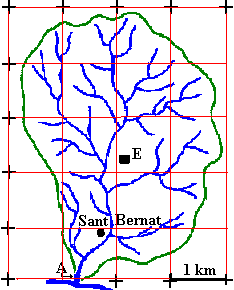 | La figura adjunta representa el perímetre d'una conca hidrogràfica. La nit anterior es va enregistrar a l'estació termopluviomètrica E de la conca una precipitació de 20 mm. Considereu negligibles l'evapotranspiració i la infiltració. Fa dos anys la població de Sant Bernat, situada a la part final de la conca, va haver de canalitzar el riu per evitar el risc de riuades i es va construir una canal de 4 m de altura i 10 m d'amplada. | ||