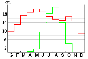 | Amb una taula de valors mitjans mensuals de precipitació (color verd) i evapotranspiració (color vermell) potencials hem confeccionat aquesta gràfica de balanç hídric anual de Kayes.