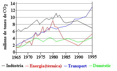 | Si es manté el ritme actual, es preveu que al voltant de l'any 2100 s'arribarà a un contingut atmosfèric de CO2 doble de l'existent en èpoques preindustrials. Per aconseguir una estabilització raonable del contingut de diòxid de carboni atmosfèric (450 ppm) s'ha d'aconseguir que al voltant de l'any 2025 les emissions de CO2 es redueixen als nivells de 1990 i que després disminueixin notablement per sota d'aquest nivell. La gràfica adjunta mostra l'evolució de les emissions de CO2 a Catalunya en els darrers anys (La Vanguardia, 18 de desembre de 1997). | |