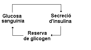 | Aquest diagrama mostra les relacions entre la concentració de glucosa a la sang i la secreció de l'hormona insulina. Si la quantitat de glucosa sanguínia és molt elevada, el pàncrees segrega insulina i aquesta fa que la glucosa sigui absorbida pel fetge i s'acumula en forma de glicogen. | |