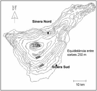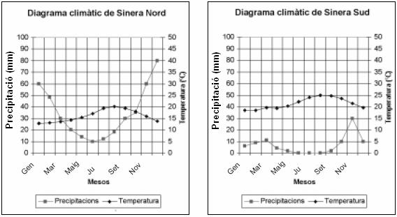 | Els gràfics següents representen les dades climatològiques de dues poblacions situades als dos extrems d’una illa volcànica de la qual s’adjunta el mapa topogràfic. Les condicions climàtiques, orogràfiques i els vents dominants, entre altres, han condicionat la distribució de comunitats vegetals de tal manera que al nord dominen les comunitats arbustives denses i al sud les herbàcies disperses, xeròfiles o adaptades a la sequera. | ||||||||||