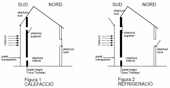 | El bioclimatisme es basa en l’aprofitament de l’energia solar a partir d’un determinat disseny dels edificis. Una proposta bioclimàtica és l’anomenat mur Trombe. A les figures 1 i 2 podeu observar un esquema del funcionament d’aquest element arquitectònic aplicat a una casa. Es basa en la idea que el mur absorbeixi la radiació solar i, donada la seva conductivitat tèrmica, transfereixi l’energia a l’interior de l’edifici unes hores més tard. | ||||||||||||||||||||||