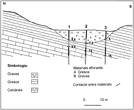 Fins a 5,5 m de fondària, graves; de 5,5m a 9,5 m, gresos; a partir d’aquesta fondària, calcàries.