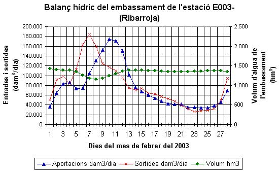 | El passat mes de febrer del 2003 el riu Ebre va experimentar importants crescudes a conseqüència de les precipitacions que es van produir a la capçalera de la conca. La gràfica adjunta representa el balanç hídric de l’embassament de Ribarroja durant el mes de febrer del 2003. | |||||||||||||||