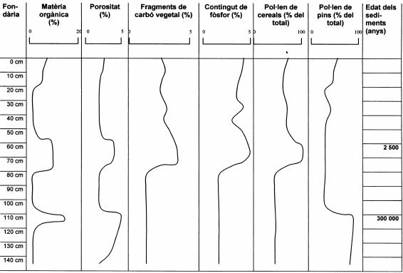 | Un equip d’arqueòlegs dirigit per Eduard Calafell està estudiant un jaciment iber d’uns 2.500 anys d’antiguitat, situat sobre un con de dejecció. Un dels punts de discussió és l’ocupació del territori i la possible activitat agrícola, ja que, si bé s’han trobat aixades i altres estris agrícoles, els habitants d’altres poblats ibers de la mateixa època eren pastors i recollien productes dels boscos. L’edafòloga de l’equip ha fet diferents anàlisis en un sòl representatiu dels afores del jaciment, format sobre el con de dejecció actual, que ha experimentat una sedimentació progressiva i continuada des de fa més de 300.000 anys. Aquesta regió estava ocupada per boscos de pins durant el paleolític (fa 300 000 anys). | |||||||||||||||||||