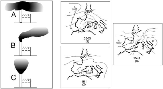 | En un treball de recerca d’una alumna de batxillerat s’ha fet un estudi per relacionar el temps meteorològic amb la forma dels plomalls d’una indústria de Catalunya. Les diferents formes i les situacions meteorològiques es poden observar en les figures següents. | ||||||