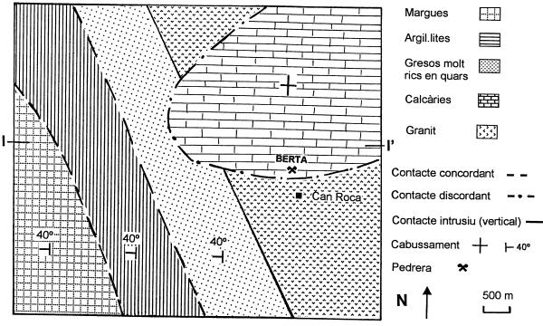 El mapa geològic adjunt correspon a una zona on tradicionalment s’han explotat les roques per ús industrial. Darrerament s’ha instal·lat a la zona una nova empresa que vol explotar les argil·lites.