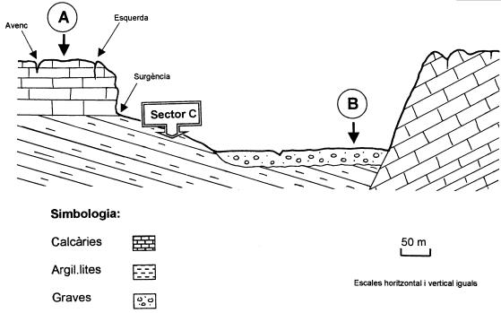 | Els processos geològics externs són fenòmens dinàmics que, de manera natural, es desenvolupen sobre el nostre territori. Quan les activitats humanes es poden veure afectades per aquests processos, es generen situacions de risc. El tall geològic adjunt n’és un exemple. | ||||||||