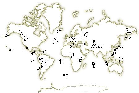 Aquest mapamundi mostra la localització d'alguns volcans (triangles), epicentres de terratrèmols (cercles) i orògens (muntanyes):