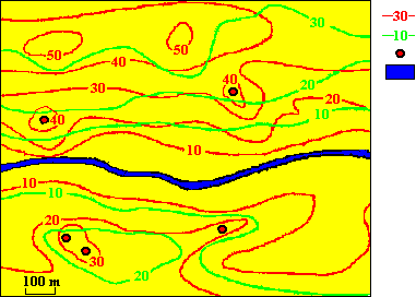 Aquest mapa d'isòbates (línies que uneixen punts de la mateixa profunditat del nivell freàtic) representa els marges d'un riu.