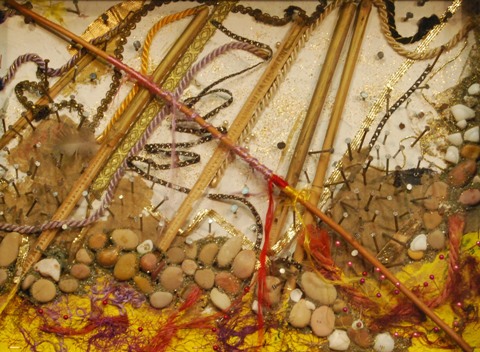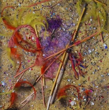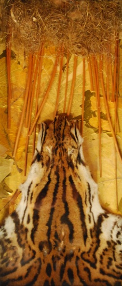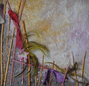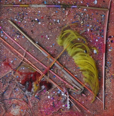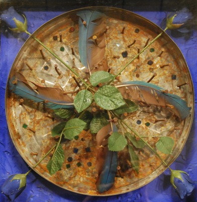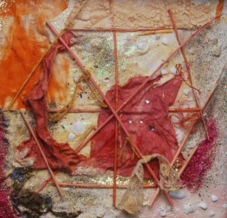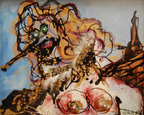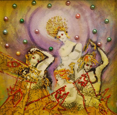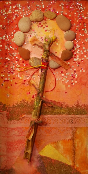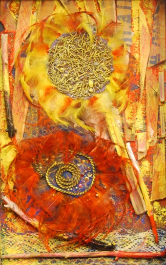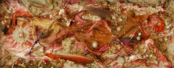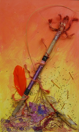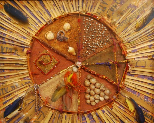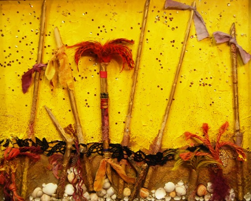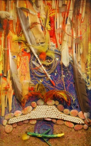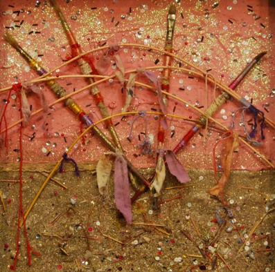 La composición y el color evocan ciertos el trabajos pretéritos del pintor que enlazan con propuestas y mensajes de nueva factura, de tinte intercultural, que se combinan y entrelazan con un sinfín de objetos cuya presencia, forma, significado, textura, color y riqueza establecen, por sí mismos, un diálogo, a veces ritual, que el artista aborda y modera con la vocación de un chamán locuaz y las artes de un pintor que ha enmudecido.