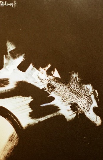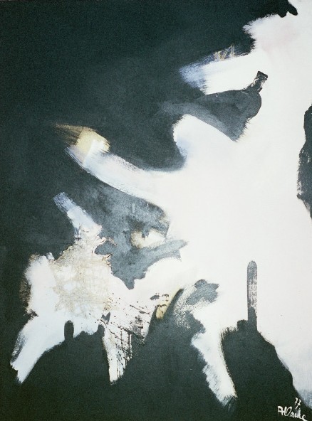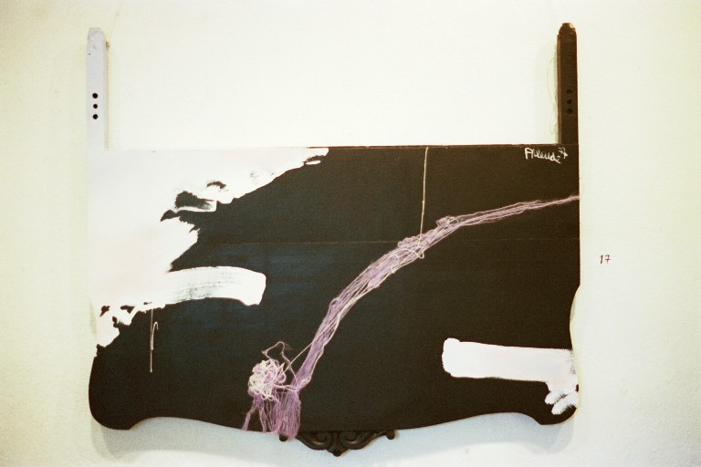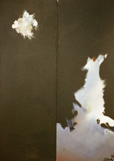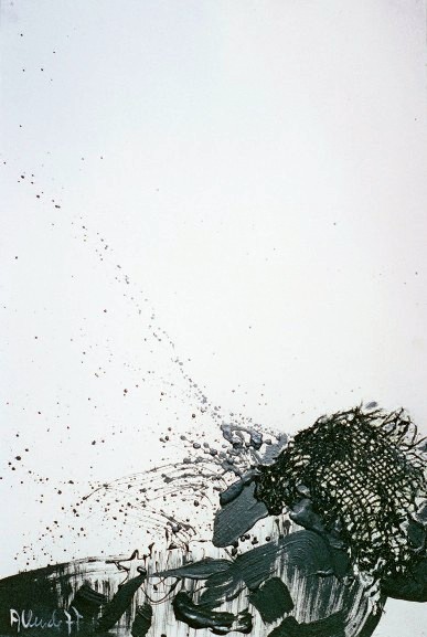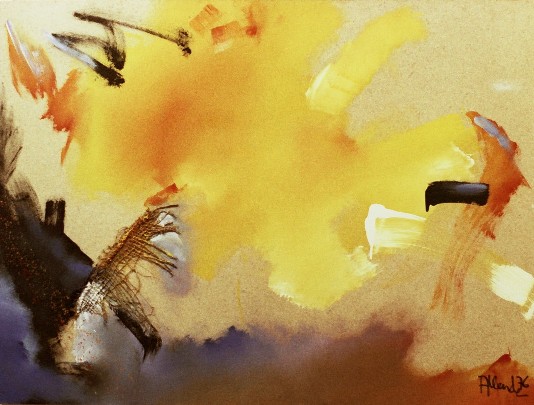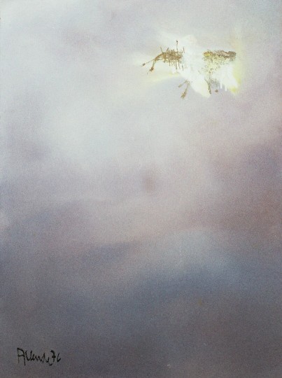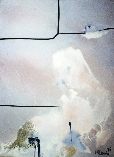 El cielo, las nubes, el binomio cromático azul y rosa y los trazos negros funden densas brumas luminosas en el plano, cuyo espacio es recorrido por el vuelo de un ave peregrina, sin rumbo conocido, representada icónicamnete por un relieve de arpillera que planea en una atmósfera celestial, ingràvida y abstracta.