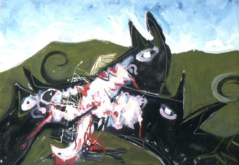 " Lobos negros malvados descuartizando a una indefensa gallina blanca"
