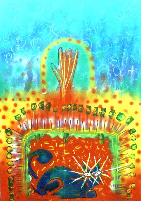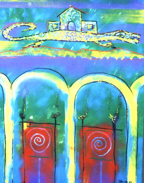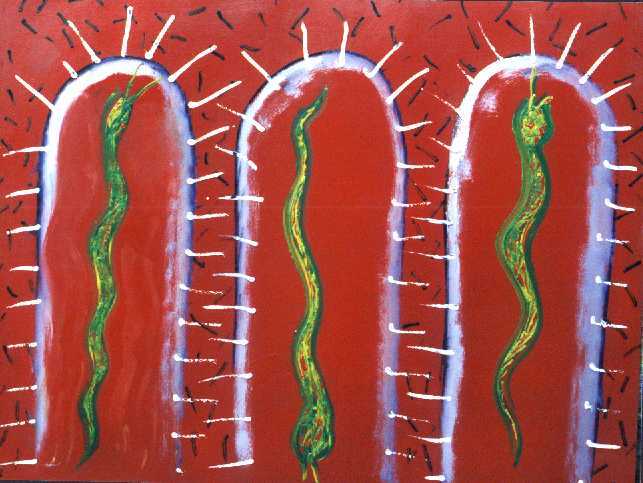 "Tres serpientes verdes dentro de tres arcos blancos"