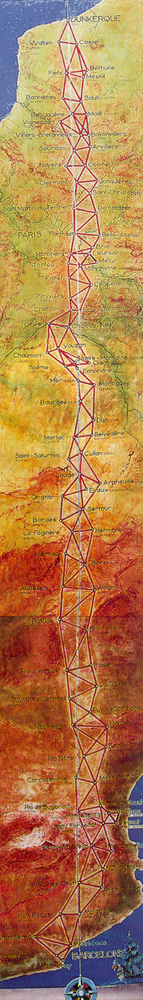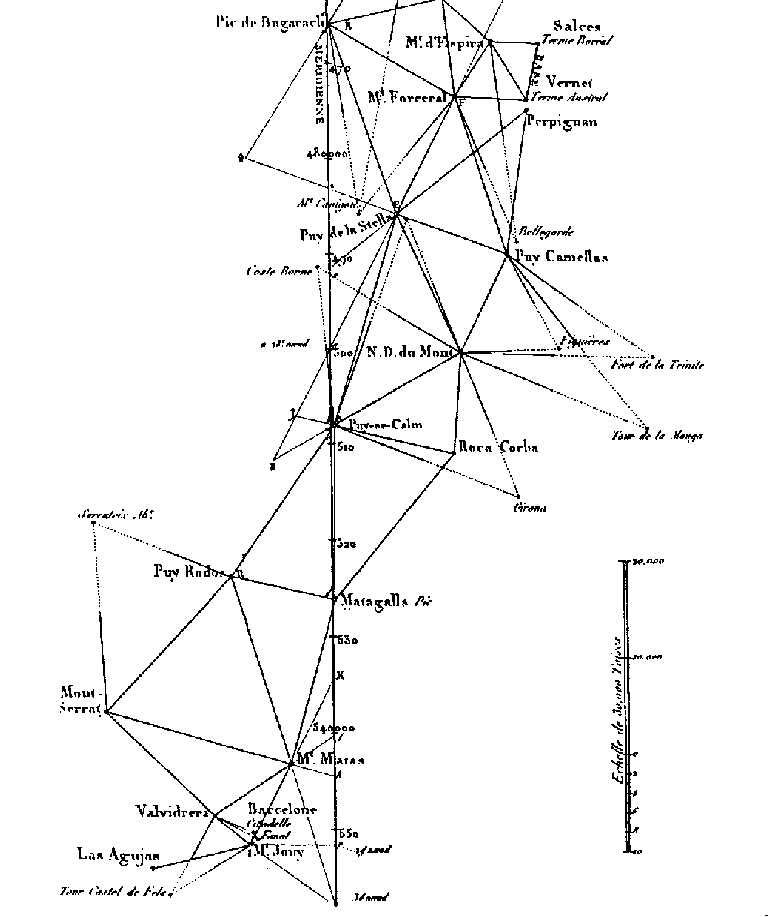 Sols es van mesurar dues distàncies directament, una d'elles aprop de Perpinyá entre Salces (ara Salses-le-Chateau) i Vernet. Va mesurar 6.006,25 toesas de Perú (el patró utilitzat) que equivalen a 11.706,18 metres.