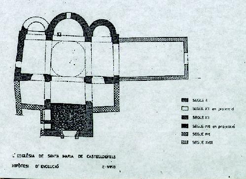 La iglesia original era un pequeño edificio (pre-románico), con forma de planta de cruz latina, con tres ábsides semicirculares en el crucero dedicados a Sta Maria, San Miguel y San Juan, y coronado por un cimborio sobre el que descansa un pequeño campanario de torre. Religiosamente dependía del Monasterio de Sant Cugat, pero durante unos años va administró sus bienes con independencia del monasterio. |