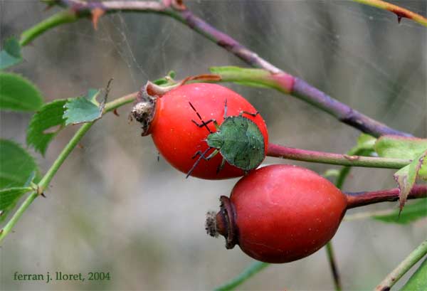 Les gavarres al zenit de la seva coloració, fruits de roser (Rosa sp.) amb bernat pudent (Nezara viridula)