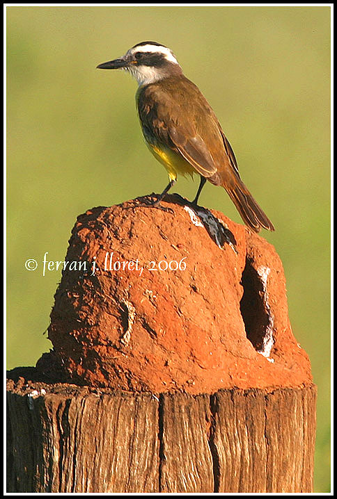 El Bem-te-vi (Benteveo comú a l’Argentina) es un au que pertany al ordre del Passeriformes i a la família Tyrannidae, pertanyen a aquesta família un grup d’aus de comportament agressiu i tirànic. Els noms comuns fan referència a la transcripció del seu cant. Arriben als 24 cm., al cap te una corona i un antifaç negre, i una corona oculta groga sobre el cap, la franja entre l’antifaç i el coll es blanca, el pit i la panxa d’un groc sofre, color del que deriva el seu epítet específic, l’esquena es de tonalitats marronoses. Es un omnívor d’ampli espectre, s’alimenta bàsicament d’insectes, cucs, larves, rosegadors, fruits, cargols, peixos d’aigües poc profundes que caça com un blauet, rèptils com ara tortugues de llacuna, colobres, llavors, i d’altres invertebrats. A la foto sobre un niu de joão-de-barro (Fornarius rufus) |