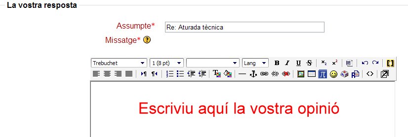 Si el fòrum té debats oberts i entreu en algun d'ells, veureu l'enllaç "Contesta" a cada una de les entrades. Si cliqueu a sobre d'aquest enllaç s'obrirà una pantalla on podreu escriure la vostra intervenció.