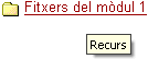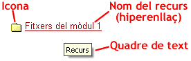 Els recursos i les activitats que trobeu en els blocs centrals es poden identificar gràcies a una icona que us permet diferenciar el tipus d'ítem. A continuació hi ha el títol, que és també un hiperenllaç al recurs o l'activitat que identifica. Si deixeu el punter sobre el nom, s'obre un quadre de text emergent que us dóna informació per identificar el tipus d'activitat de què es tracta.