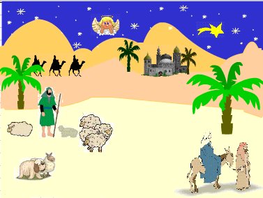 the kings the sky the mountains the village the dog the clothes the shepherd the sand the star the donkey the sheeps the palm trees the angel Joseph and Mary