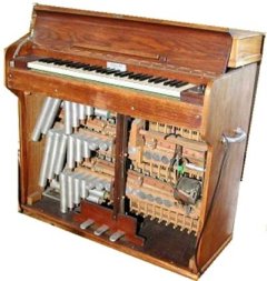És un teclat amb un sistema de palanques que percudeixen un joc de campanes tubulars. Mireu-ne una de tancada i una d'oberta . |