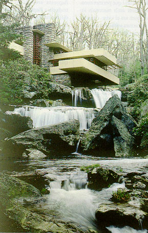 Autor: Frank Lloyd Wright. Està situada en una roca sobre una cascada natural i està edificada en tres nivells. L'home vol dominar i gaudir alhora de l'aigua; edifica damunt seu i perverteix la Naturalesa fent que l'aigua brolli de l'interior de la casa |