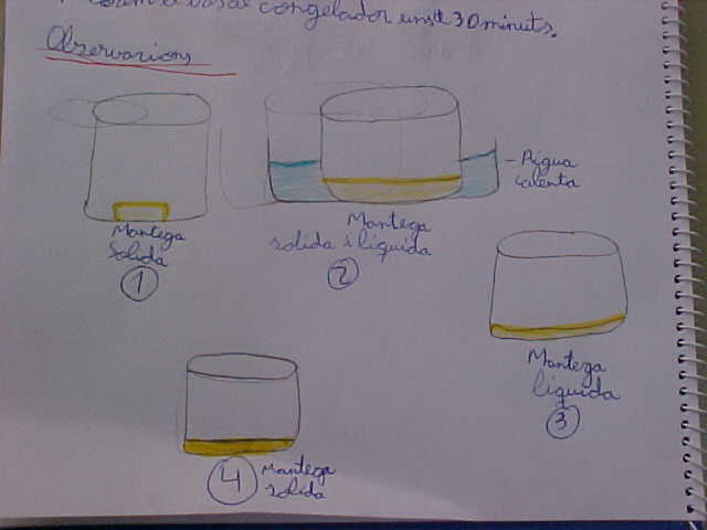 | La mantega quan la comprem és en estat sòlid. Quan escalfem el vas la mantega es fon, passa d'estat sòlid a líquid. Aquest canvi es diu Fusió. Quan hem refredat el vas al congelador la mantega líquida s'endureix, passa d'estat líquid a sòlid. Aquest canvi es diu Solidificació. | |
