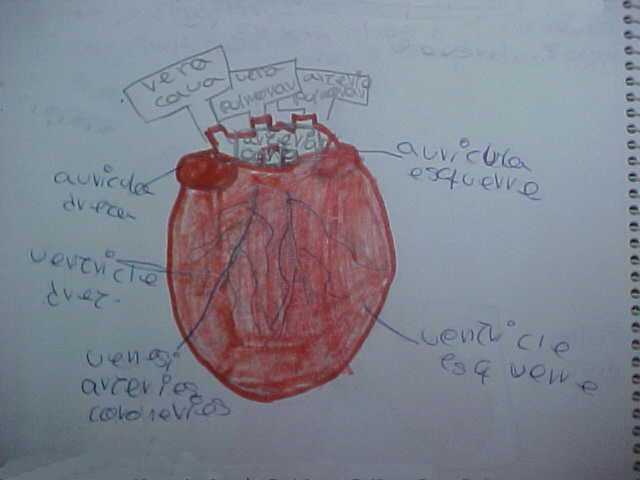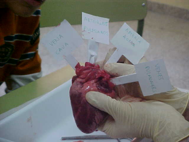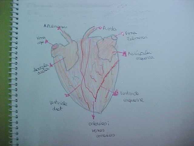 El cor té dues aurícules i dos ventricles. Les aurícules són molt petites i els ventricles són molt grans. Per la part de fora del cor es veuen unes artèries que es diuen coronàries. També hi ha una mica de greix que fa una funció protectora quan hi ha algun cop. A dins dels ventricles es poden veure uns músculs molt forts i elàstics que fan bategar el cor. |