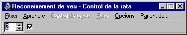 -Hi veiem la barra de títol. Aquí s'escriurà el so o paraula reconeguda. -Hi ha una barra de menús que descriurem mes endavant. -Un quadre d'edició que es pot graduar amb fletxetes amunt i avall. És on hi ha escrit el número 2. Aquest és el número de píxels que es mou la rata. O sigui quant més gran sigui aquest número més de pressa es mourà la rata. Per modificar-ho escrivim el número o cliquem les fletxetes. Tal com és de bon suposar, el número més petit és l'1. Aquest valor el podrem, tal com veurem més endavant, canviar amb la veu. -Un quadre checkBox, per si tenim els botons de la rata intercanviats. Hi ha gent que fa servir la rata amb la mà esquerra i té els botons intercanviats, com és el meu cas, per això ho veieu activat. En principi això no s'hauria de tocar perquè el programa detecta automàticament si hi ha o no els botons intercanviats i o deixa en l'estat checked o Unchecked, segons hagi detectat. Deixem l'opció a la vista per si algun ordinador té algun comportament estrany. Això serà quant fem l'ordre clic i aquesta sigui incorrectament entesa, veurem clic en el títol de la finestra i en lloc de fer clic s'obrirà el menú contextual que és el que acostuma a passar quan cliquem amb el botó dret. Quan passi això es tractarà de check o Uncheck, el botó segons convingui. -Al costat d'aquest botó hi ha un espai gris. Aquí s'hi escriuran les ordres que pot entendre amb els sons corresponents si el reconeixement es fa per sons. Més endavant entendrem què volem dir amb això. A continuació passem a descriure les opcions dels menús: Menú Arxiu Hi ha quatre opcions, n'hi ha algunes que s'habilitaran o deshabilitaran, es tornen grises, segons l'estat del programa. Obrir..., permet carregar un fitxer de patrons que prèviament hàgim desat amb aquest programa. Actua de la mateixa manera que ho hem explicat abans. L'extensió per defecte d'aquest programa és: RataTpmSR02, tal com sempre es recomana no és bo canviar-la. El programa, automàticament, a l'iniciar-se, s'associa amb aquesta extensió. Si hi hagués un altre programa amb aquesta mateixa extensió, cosa altament improbable, excepte que tinguem dues o més còpies d'aquest programa en el nostre disc dur, ens preguntarà si volem associar-lo a ell. Recordem que si el fitxer conté dades correctes, un cop carregades ja començarà el reconeixement. En cas que no siguin correctes ja se'ns avisarà mitjançant un quadre de missatge. Guardar..., permet desar les dades de reconeixement prèviament recollides amb l'opció Entrenament en un fitxer del disc. Tal com hem dit abans, l'extensió per defecte és: RataTpmSR02 i no és convenient canviar-la. Veure el nivell del so..., dóna accés al mateix quadre sobre el nivell del volum del so que hem explicat abans. Sortir, permet abandonar el programa. Menú Aprendre Hi ha només una opció. És així perquè no es cliqui sense voler: Entrenament..., És l'opció que permet que l'ordinador aprengui a reconèixer la nostra veu. És la mateixa que hem parlat abans en el quadre inicial, però que no hem explicat en profunditat. A partir d'aquí comencem a tractar les particularitats del programa, ja que fins ara, sobre el que hem parlat acostuma trobar-se, coses semblants, a la majoria de programes. En primer lloc apareix el quadre següent:
