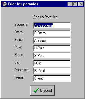 Cliquem a No, en lloc de fer el reconeixement per sons ho farà per paraules i prèviament se'ns ofereix un quadre on podem canviar les paraules. Per si parlem un altre idioma o volem provar-ho amb altres paraules que ens sembli milloraran el reconeixement. Aquí recordem que en realitat el programa no distingeix tota la paraula sinó només les 4 primeres dècimes de segon. O sigui el reconeixement serà millor com més diferents siguin les 4 primeres dècimes de segon de les paraules.