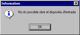 Caldrà acostar-nos al micròfon i dir el so AE (Vocal neutra) durant molt poc temps, un parell o tres dècimes de segon. Quant l'hagi detectat desapareixerà el quadre. Si desapareix massa depressa o sigui, abans que no hàgim dit res potser és per culpa que tenim el micròfon massa sensible. Recordeu el que hem explicat abans sobre utilitzar l'opció control de volum del micròfon. Al principi seria un bon costum tenir aquesta finestra sempre oberta per veure si cridem massa fort o fluix o tenim el valor del micro massa amunt o massa avall. Si, pel contrari, per més que cridem no passa res, o sigui que no desapareix aquest quadre pot ser degut a les següents causes: o el micròfon no està correctament endollat a la targeta de so o el nivell del micròfon està massa avall. En aquest últim cas aneu a l'opció control del volum. En el cas que no hi hagués targeta instal·lada, o estigués mal instal·lada o hi hagués un altre programa fent servir l'entrada de veu com pot ser la gravadora de Windows o el wave estudio de la Sound Blaster. Abans que sortís l'anterior quadre us sortiria el següent: