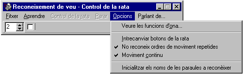 L'únic canvi visible és que l'opció parar s'ha desactivat, color gris, i l'opció Control de la rata s'ha activat. En aquest moments per molt que cridem el programa no s’escolta. Si volem que ens torni a fer cas, clicarem a l'opció Control de la rata i tornarà a començar el reconeixement i interpretació d'ordres. Quan no funciona el reconeixement veureu que el menú Guardar com... està activat, aquesta és l'opció que farem servir si els patrons de reconeixement són prou bons i volem guardar-los per una altra ocasió i no volem fer el reconeixement. Si fem que el reconeixement estigui actiu, opció Control de la rata, podrem fer les nostres primeres experiències de reconeixement automàtic de la veu amb interpretació d'ordres amb el programa del qual estem parlant. Si dieu els sons, AE, È, U, A, I, S, R, É, veureu si el programa us fa cas. És possible que al principi no us cregui gaire, si no es mou cap allà on voleu mireu al títol de la finestra i mireu quins són els sons que detecta. Menú opcions