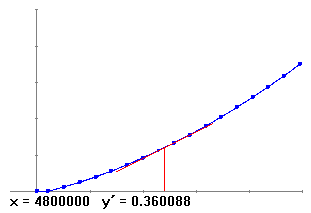 Hi ha un resultat espectacular. El que hem fet ara és utilitzar un concepte matemàtic la funció per explicar un concepte econòmic. Què és el que toca pagar a hisenda en funció del que un cobra. Però ara podrem veure com un concepte econòmic (tipus aplicable) pot ajudar-nos a entendre un concepte matemàtic (derivada en un punt). El tipus aplicable és el % que s'ha de pagar per les pessetes que passen d'un tram. Així per exemple una persona que cobri 4.800.000 pessetes ha de pagar 1.124.000 de pessetes per les primeres 4.575.000 pessetes que cobra, el tipus aplicable és el % que paga (1.205.019-1.124.000 = 81019) per les (4.800.000-4.575.000) 225.000 ptes. restants. Que és el 36%. Calculem la derivada en el punt 4.800.000.