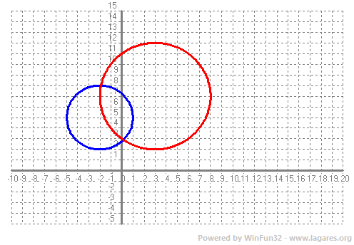 A C' necessitem trobar el radi que és la distància entre els dos punts, `(3,7)-(-2,7)=(5,0)` i ara cal calcular el mòdul, `r=sqrt(5^2+0^2)=5` Per la qual cosa l'equació de C', `x^2+y^2-2·3-2·7+3^2+7^2-5^2 =0 => x^2+y^2-6x-14y+33=0` Per trobar la posició relativa cal que resolem el sistema: `x^2+y^2+4x-10y+20=0` `x^2+y^2-6x-14y+33=0` Restant les dues equacions: `10x+4y-13=0 => y = (13-10x)/4` i ho substituïm a una de les equacions: `x^2+((13-10x)/4)^2-6x-14·(13-10x)/4+33=0` Si ho arreglem l'equació queda: `116x^2+204x-31=0` i les solucions són: `x_1=-51/58-(5sqrt(35))/29 \approx -1'9` i `y_1=(13-10·(-1,9))/4 \approx 8` `x_2=-51/58+(5sqrt(35))/29 \approx 0'14` i `y_2=(13-10·(0'14))/4 \approx 2'9` Tenim dues circumferències secants ja que es tallen en dos punts, `(-1'9,8)` i `(0'14,2'9)` ![]() Recordem que aquest problema es podia fer d'una altra manera. Es podia calcular la distancia entre els dos centres i veure que era menor que la suma dels dos radis, per la qual cosa les dues circumferències es tallen. Això és molt més senzill i infinitament més curt, però com que més endavant necessitem calcular aquests punts d'intersecció, ja tenim la feina feta :-) b-Calcula l'eix radical. SOLUCIÓ: