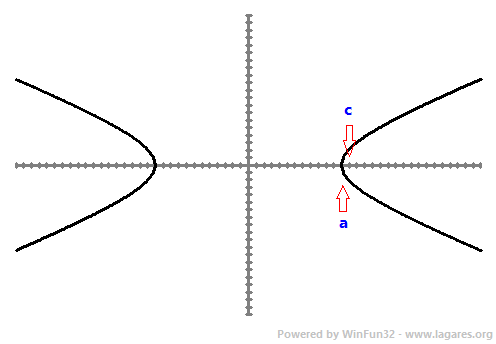 24-Troba els paràmetres de la hiperbola d'equació `x^2/144-y^2/25=1` (focus, vèrtex, excentricitat). SOLUCIÓ: `a=sqrt(144)=12 =>`Els vèrtex estan `(-12,0)` i `(12,0)`. `b=sqrt(25)=5` `c^2=a^2+b^2 => c=sqrt(144+25)=sqrt(169)=13`. O sigui les coordenades dels focus són: `(-13,0)` i `(13,0)`. L'excentricitat, `e=c/a=13/12`. ![]() |