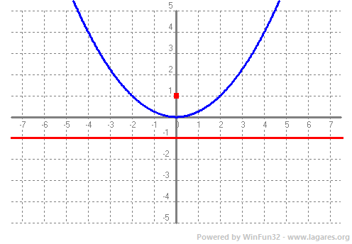 Vol dir que és del segon tipus, per la qual cosa la coordenada del focus és `(0,1)`, L'equació de la directriu és `y=-1` I el vèrtex, evidentment, `(0,0)`. ![]() La cançó que escolto mentre construeixo això. |