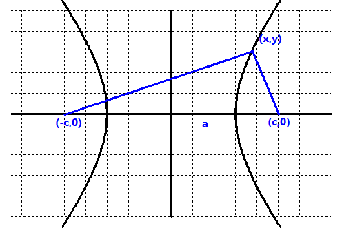 És el lloc geomètric dels punts del pla tals que la diferència de les seves distàncies a dos punts fixos anomenats focus, és constant. Aquesta constant en direm `2a`. ![]() La diferència de les distàncies `= 2a` La distància de `(c,0)` a `(x,y)= sqrt((x-c)^2+y^2)` La distància de `(-c,0)` a `(x,y)= sqrt((x+c)^2+y^2)` Aïllem una arrel quadrada, de manera que no ens quedi una suma d'arrels quadrades quan ho elevem tot al quadrat. `sqrt((x+c)^2+y^2)=2a+sqrt((x-c)^2+y^2)` Tot elevat al quadrat `(x+c)^2+y^2=4a^2+2·2a·sqrt((x-c)^2+y^2)+(x-c)^2+y^2` `x^2+2cx+c^2+y^2=4a^2+4a·sqrt((x-c)^2+y^2)+x^2-2cx+c^2+y^2` Treiem el que és igual a cada costat de l'equació. `2cx=4a^2+4a·sqrt((x-c)^2+y^2)-2cx` Deixem sola l'arrel en un costat. `-4a·sqrt((x-c)^2+y^2)=4a^2-4cx` `-sqrt((x-c)^2+y^2)=(4a^2-4cx)/(4a)` `-sqrt((x-c)^2+y^2)=a-(cx)/a` Ho elevem tot al quadrat. `(x-c)^2+y^2=(a-(cx)/a)^2` `x^2-2cx+c^2+y^2=a^2-2cx+((cx)/a)^2` `x^2+c^2+y^2=a^2+(c^2x^2)/a^2` `x^2-(c^2x^2)/a^2+y^2=a^2-c^2` `(1-c^2/a^2)x^2+y^2=a^2-c^2` `((a^2-c^2)/a^2)x^2+y^2=a^2-c^2` Ho dividim tot per `a^2-c^2` `x^2/a^2+y^2/(a^2-c^2)=1` Si mirem el dibuix veiem que `c` és la distància del focus a l'origen i `a` és la distància del punt de tall de la hipèrbola amb l'eix de les x i l'origen `=> c>a` per la qual cosa definim `b^2=c^2-a^2 => -b^2=a^2-c^2` `x^2/a^2+y^2/(-b^2)=1` Que és l'equació de la hipèrbola centrada a l'origen de coordenades. |