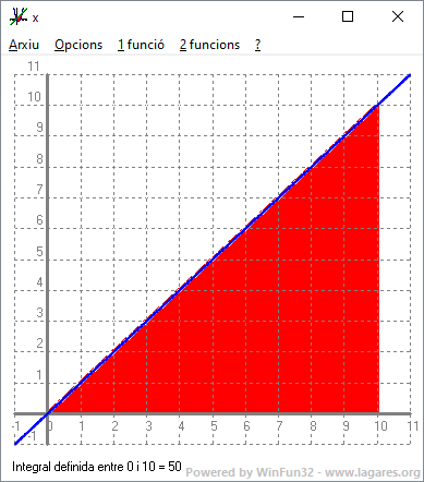 `1·(1+2+3+4+5+6+7+8+9+10)=55` 3- Calcula l'àrea entre `x=0`, `x=10`, la funció, `x` i l'eix de les `x`, fent servir propietats geomètriques del dibuix de la gràfica resultant. ![]()